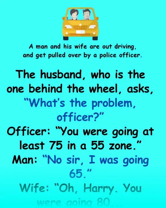 The husband, who is the one behind the wheel, asks, “What’s the problem, officer?” Officer: “You were going at least…