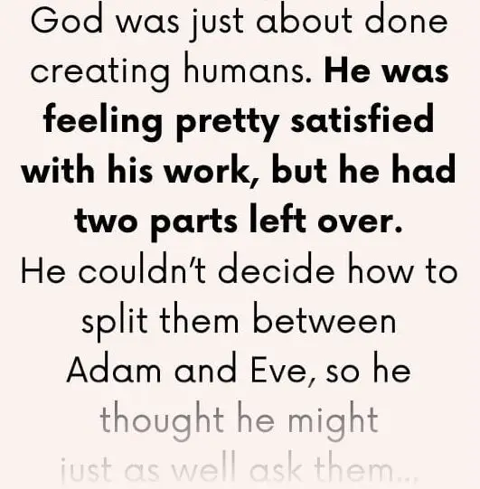——————————————————————————————————————————-God was just about done creating humans. He was feeling pretty satisfied with his work, but he had two parts…