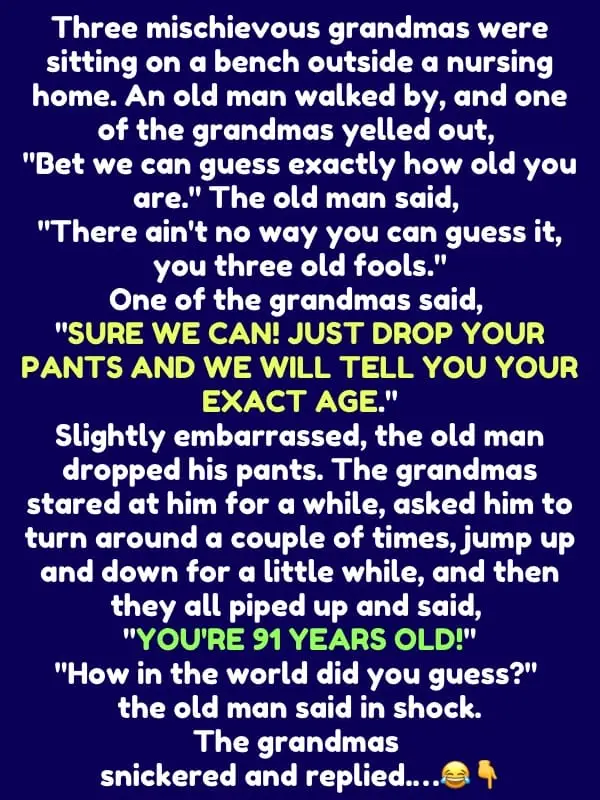 Three mischievous grandmas were sitting on a bench outside a nursing home. An old man walked by, and one of…