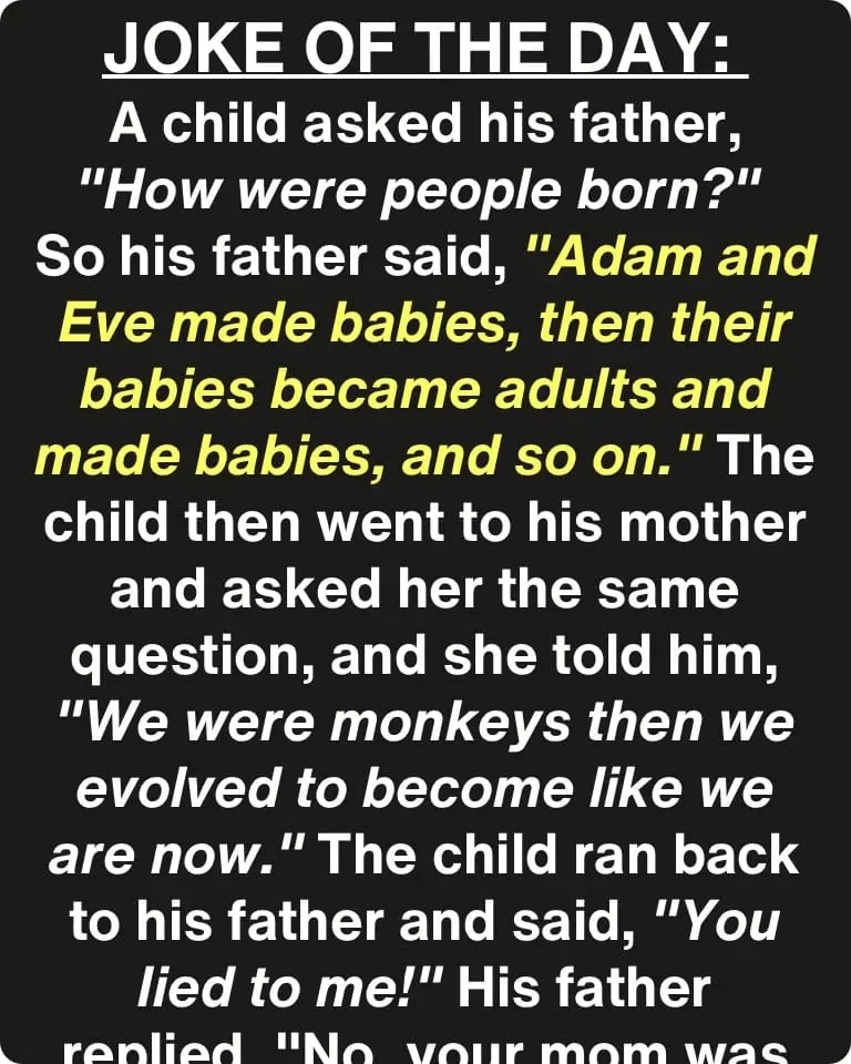 A child asked his father, “How were people born?” So his father said, “Adam and Eve made babies, then their…