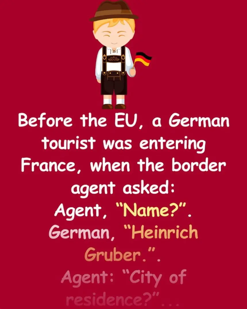 Before the EU, a German tourist was entering France, when the border agent asked:Agent, “Name?”.German, “Heinrich Gruber.”.Agent: “City of residence?”.German:…