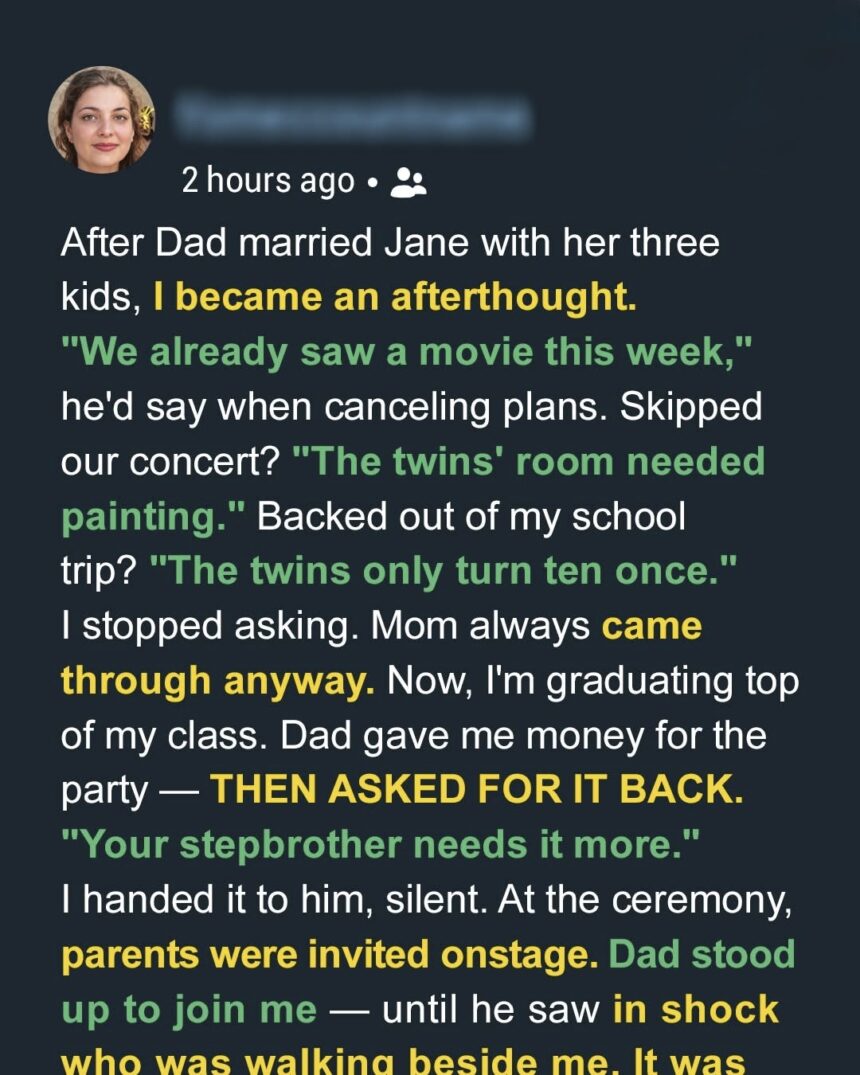 For years after my parents divorced, my father kept skipping me over for his new wife's children. When I finally…