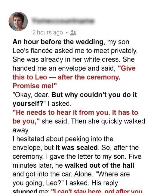 Just before the wedding, Amy handed me a sealed envelope meant for my son Leo after the ceremony. Her hands…