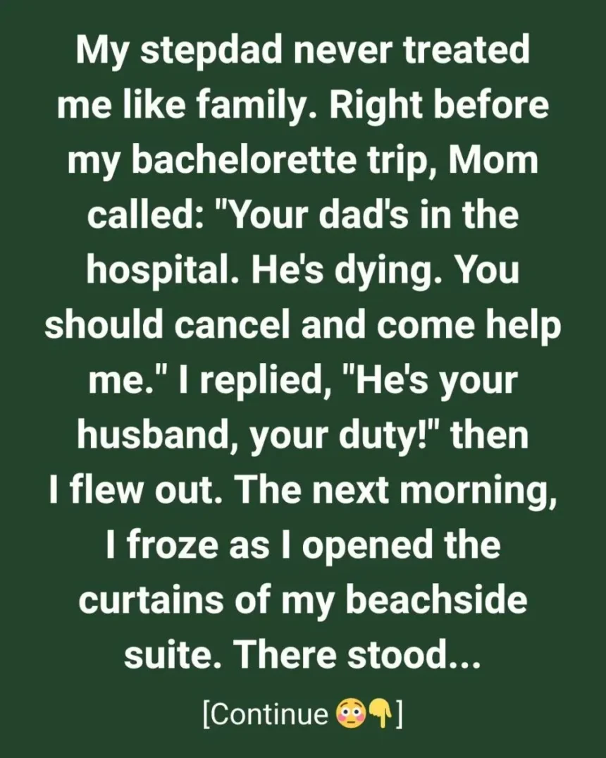 My stepdad never treated me like family. Right before my bachelorette trip, Mom called: “Your father’s in the hospital. He’s…