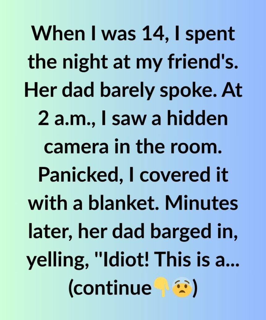 At 2 a.m., I noticed a hidden camera in the room. I panicked and tossed a blanket to cover it. 2 minutes later, her dad stormed in, shouting, “Idiot!