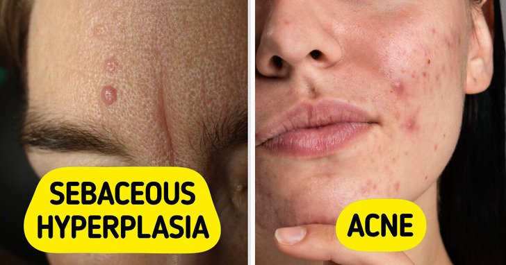Sebaceous hyperplasia may resemble acne but is actually the result of enlarged oil glands.