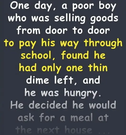 One day, a poor boy who was selling goods from door to door to pay his way through school, found he had only one thin dime left, and he was hungry.