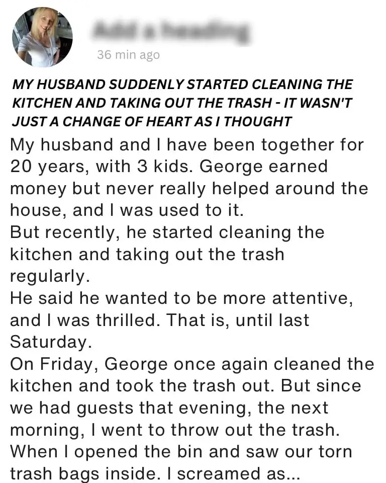 My husband unexpectedly began tidying up the kitchen and disposing of the trash. When I found out the reason behind it, I decided to get my own back.