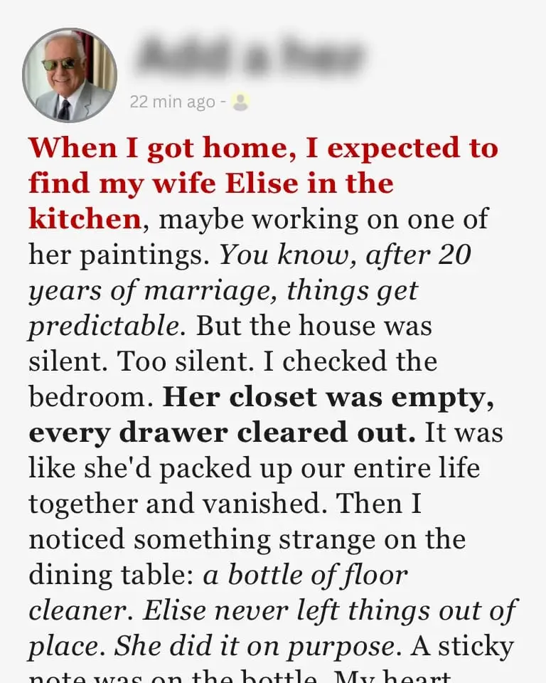 My wife abruptly ended our two-decade marriage, leaving just a bottle of floor cleaner and a note behind.