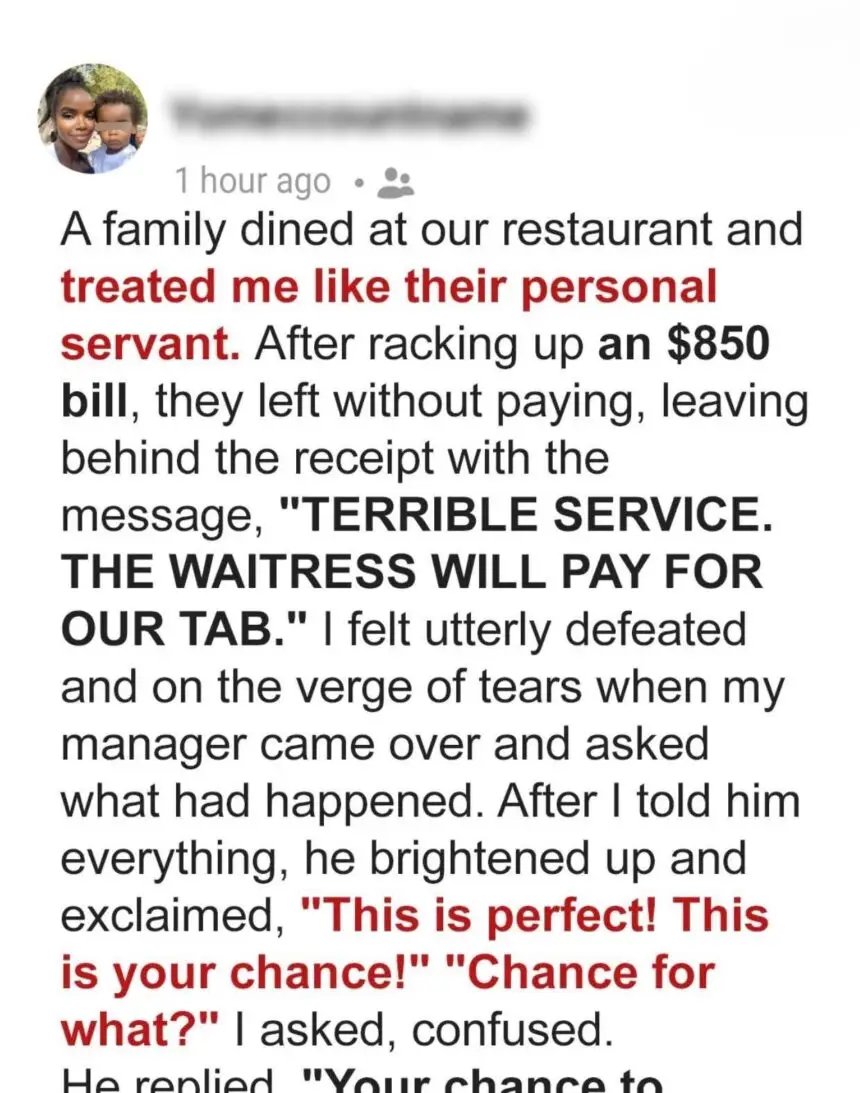 A family lambasted my service and walked out, leaving an $850 tab unpaid—but I managed to flip the situation to my benefit