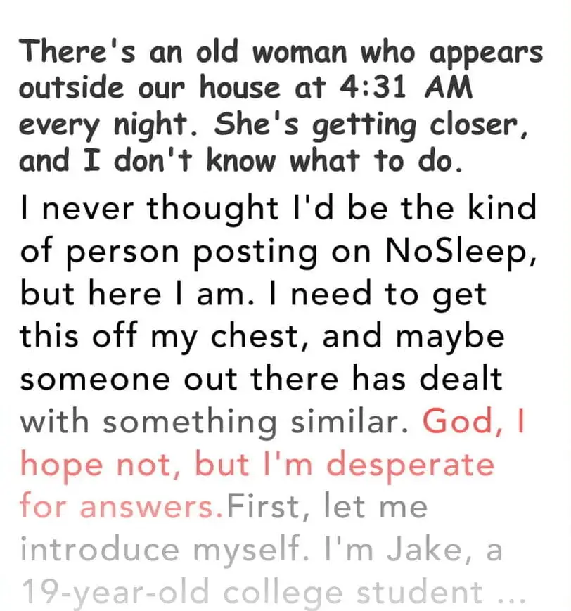 There’s an old woman who appears outside our house at 4:31 AM every night. She’s getting closer, and I don’t know what to do.